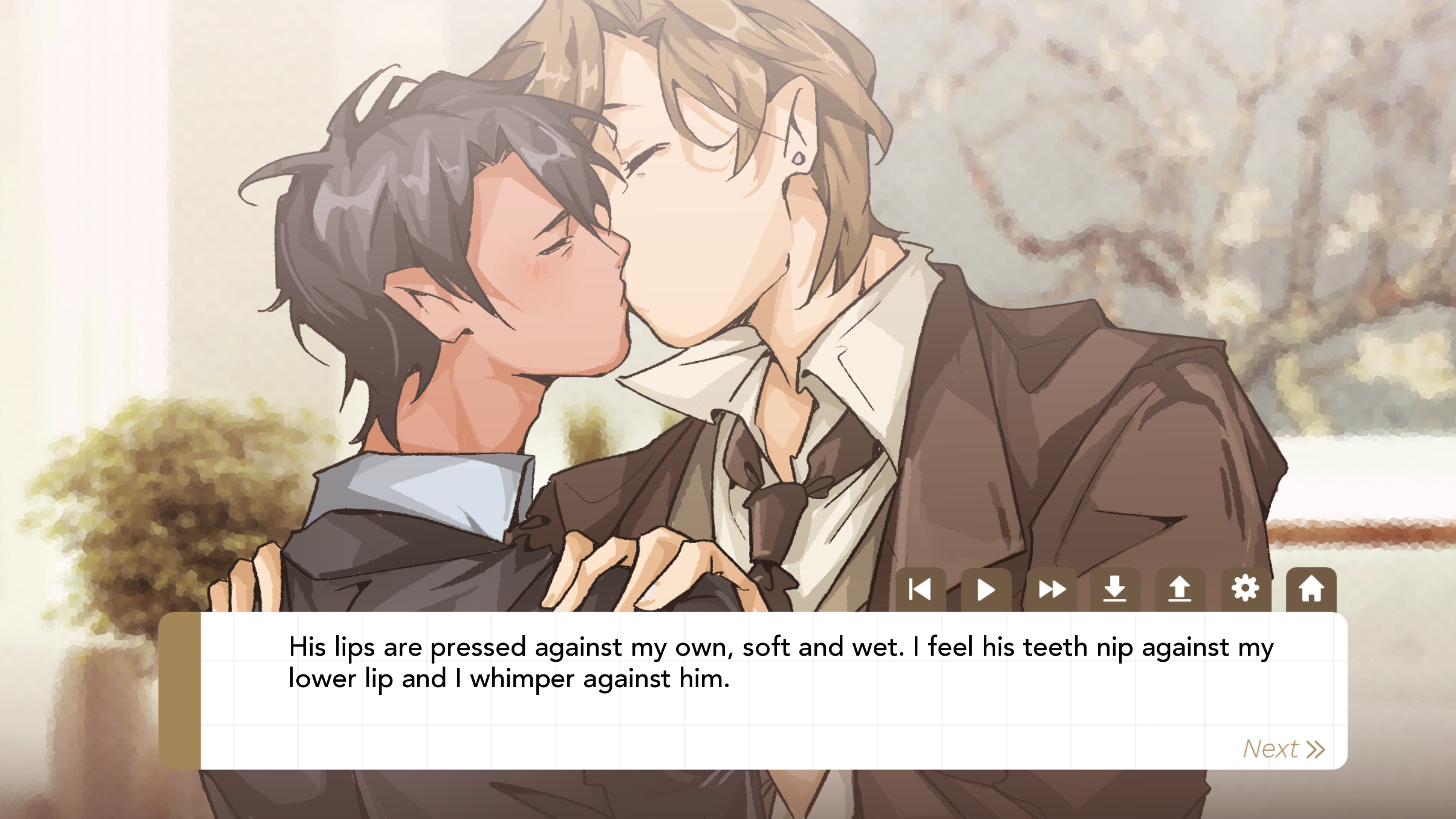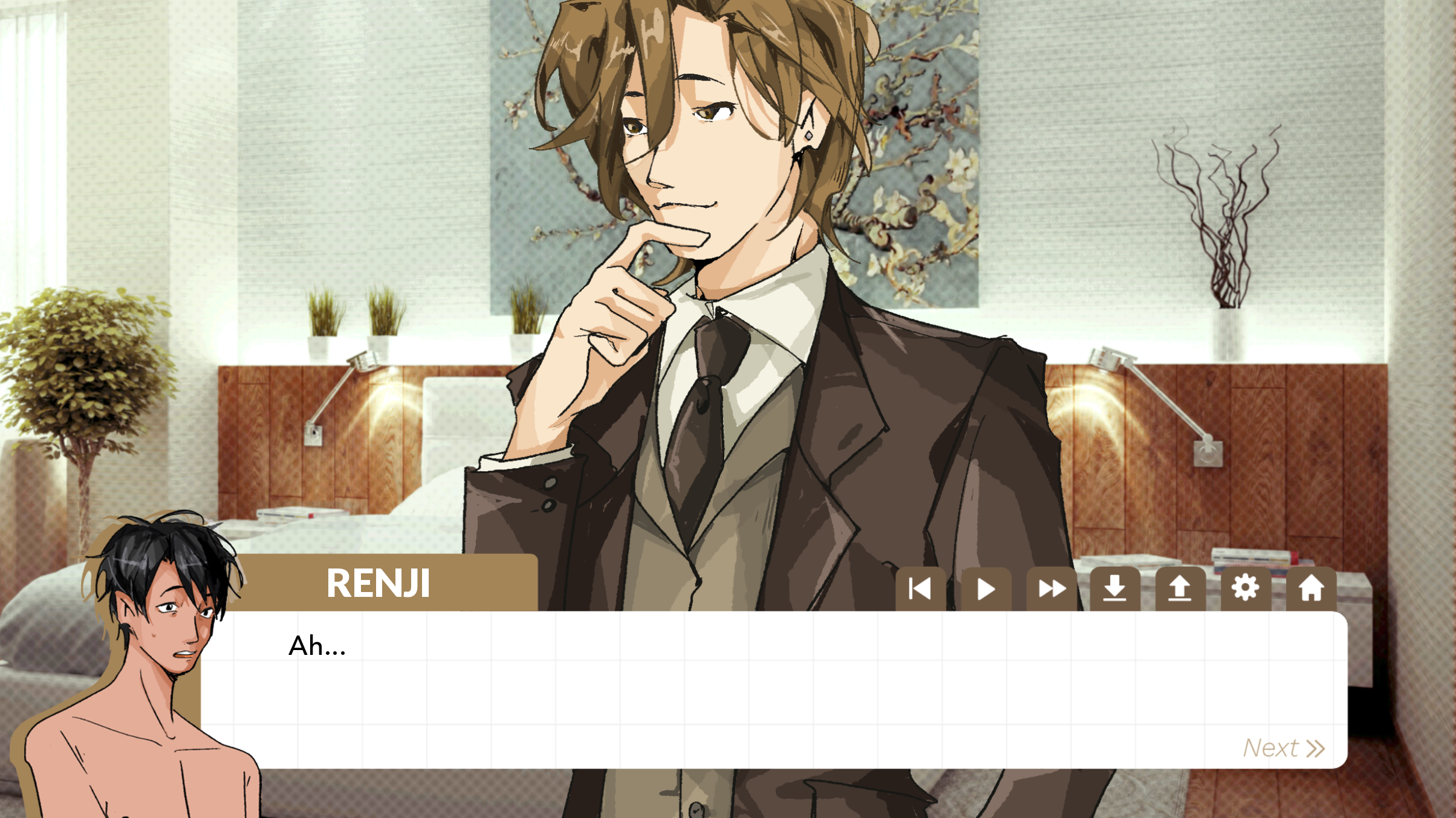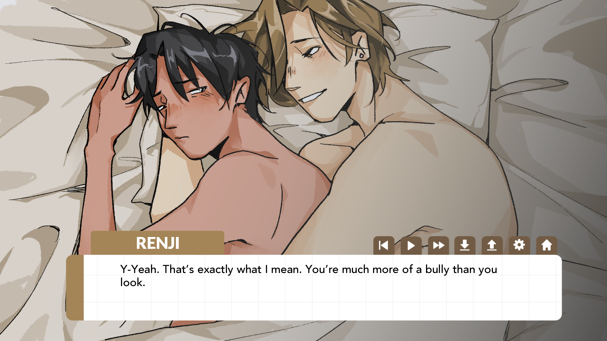 Holy shit. I feel like I've struck gold. The art is absolutely scrumptious. Renji and Ikki are so sweet and lovely to each other. And my face is flushed from those sex scenes, god. Top tier setting of the scene, the build-up, and the writing in general. For any lurkers who don't know, Tap H in game to hide the UI ;)